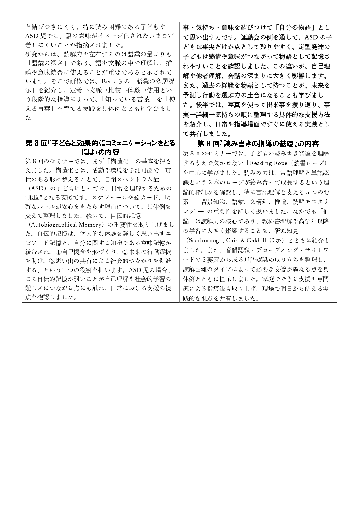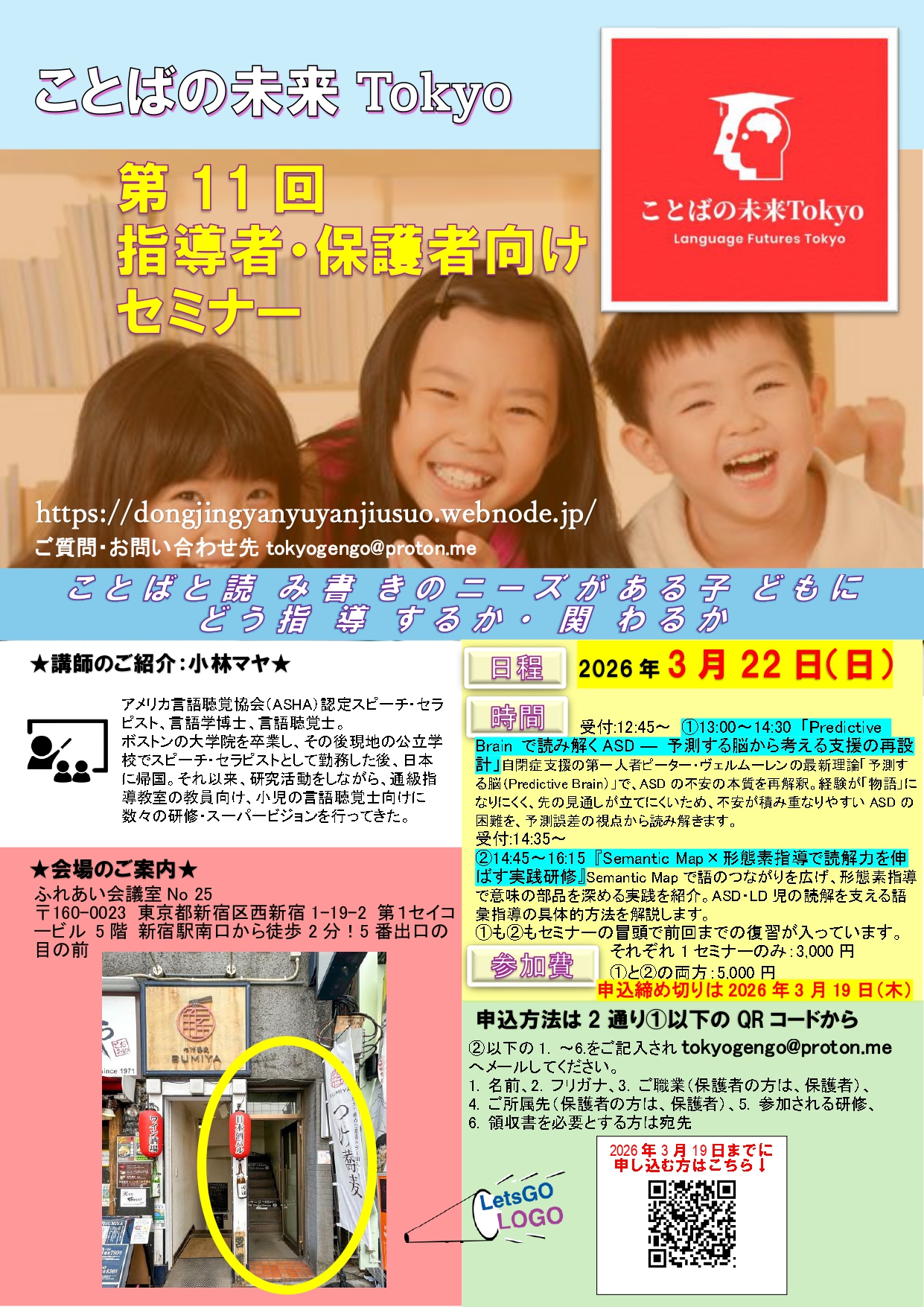 ②14:45~16:15 『Semantic Map×形態素指導で読解力を伸ばす実践研修』Semantic Map で語のつながりを広げ、形態素指導で意味の部品を深める実践を紹介。ASD・LD 児の読解を支える語彙指導の具体的方法を解説します。
